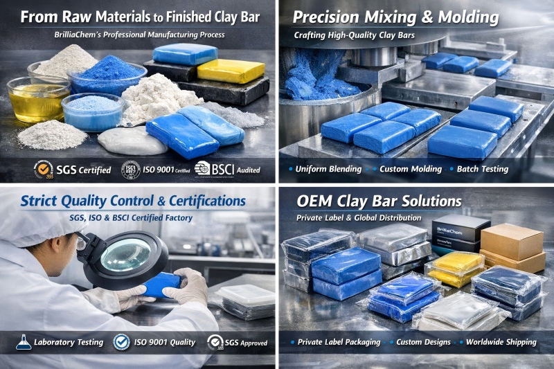 From carefully sourced raw materials to finished, high-performance clay bars, BrilliaChem demonstrates excellence in professional car care manufacturing. Our SGS, ISO, and BSCI-certified production ensures global car care brands receive safe, consistent, and premium-quality clay bars.