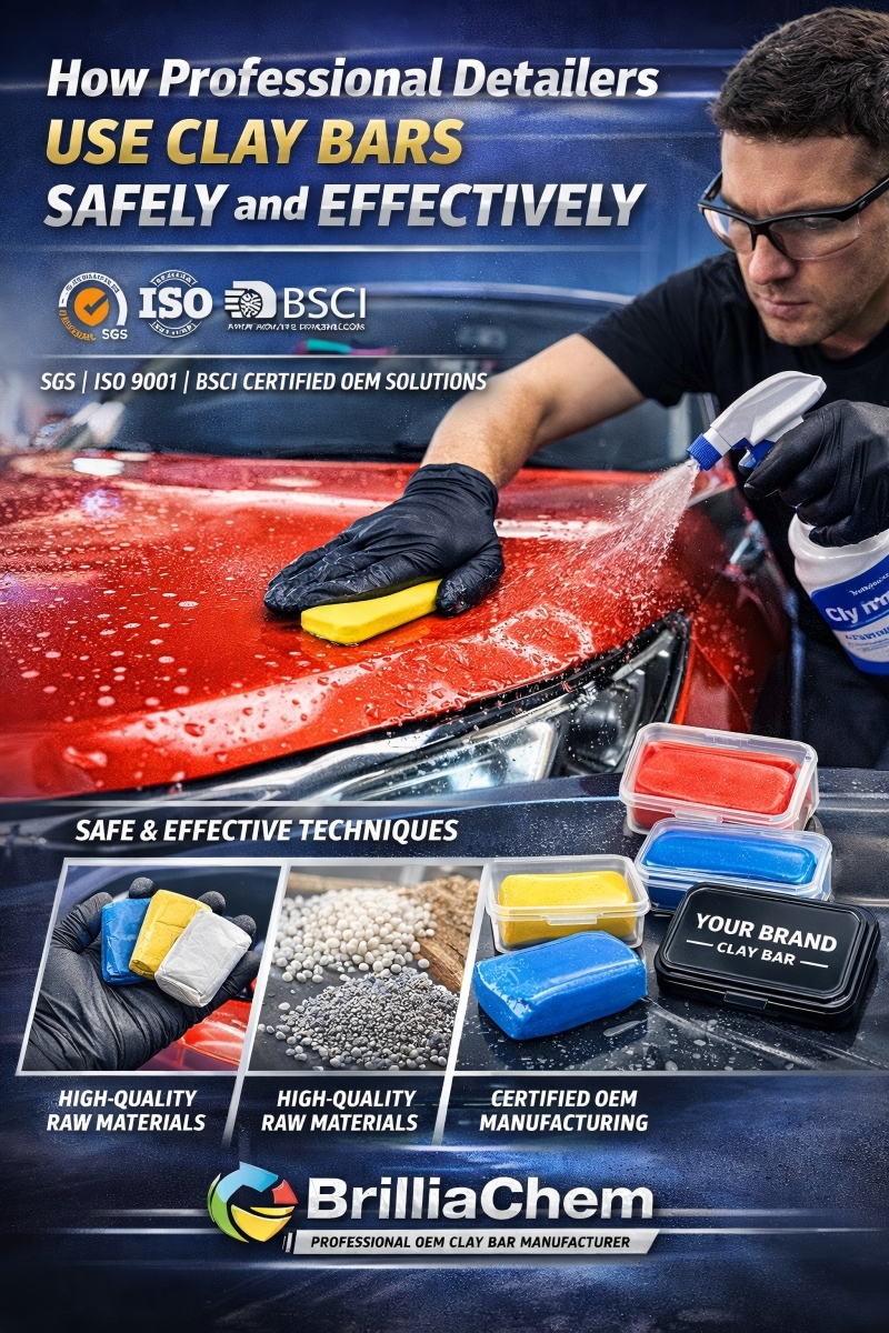 At BrilliaChem, we supply SGS, ISO, and BSCI certified OEM clay bars, designed for professional detailing applications, ensuring both performance and safety.